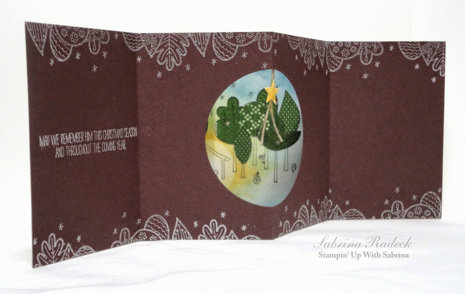 First die cut your circle from the center before folding any scorelines. Using the Whisper White ink and the treetop part of the stamp, create a top and bottom border on the Chocolate Chip card interior piece. Then stamp your sentiment on the left panel.