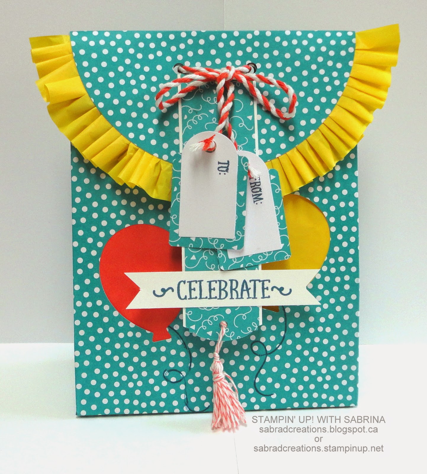 I again used the back of the card for this one and cut the front of the bag with the die-cut balloons with one of the banners and popped them up.
